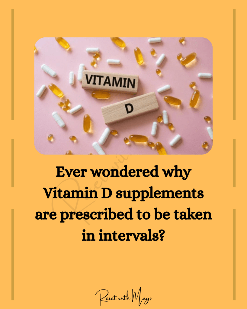 But unlike other supplements taken daily, the reason it is prescribed by doctors in intervals is because vitamin D has a long half life ie., it breaks down slowly in the body. Being fat soluble it can be stored in the body for future use as well.